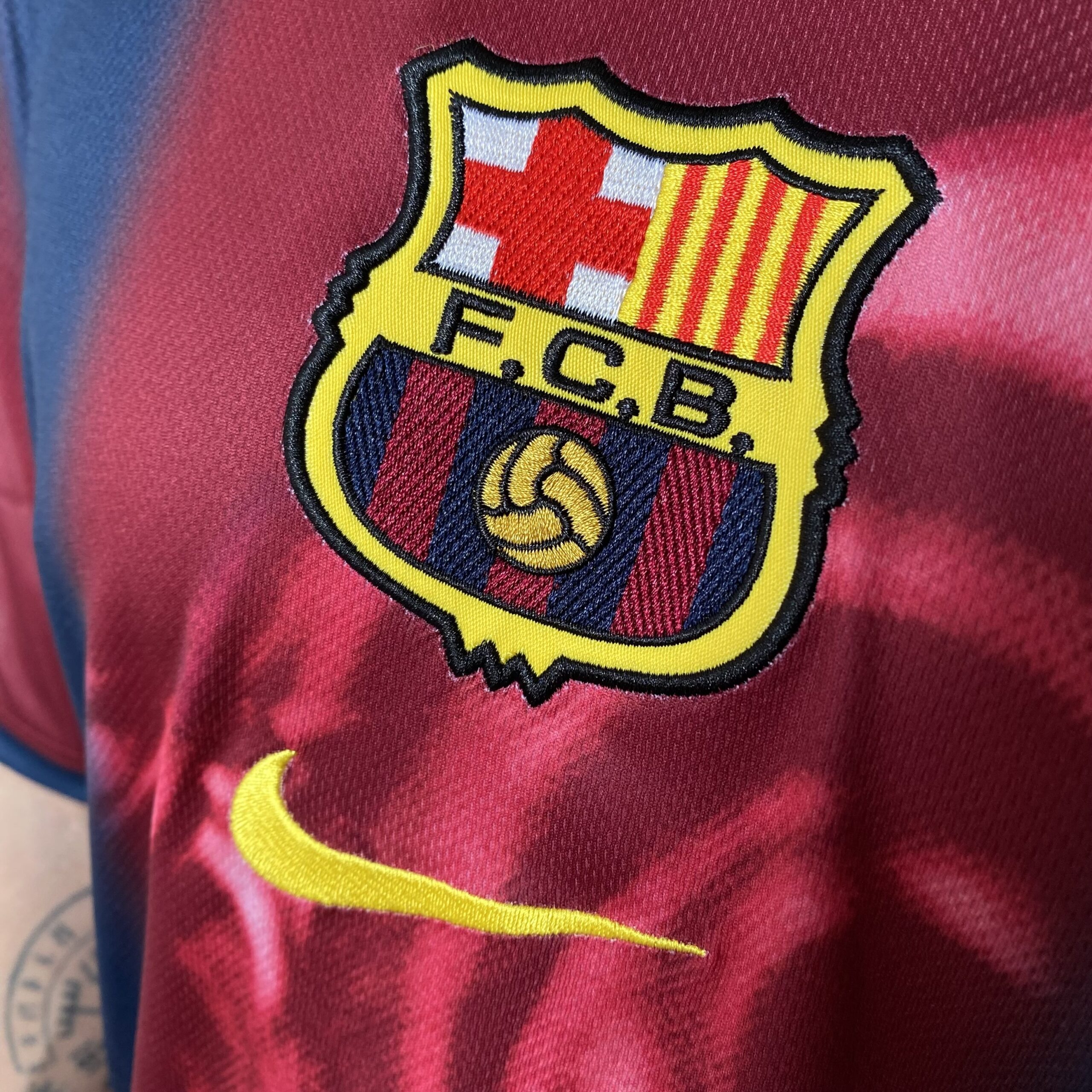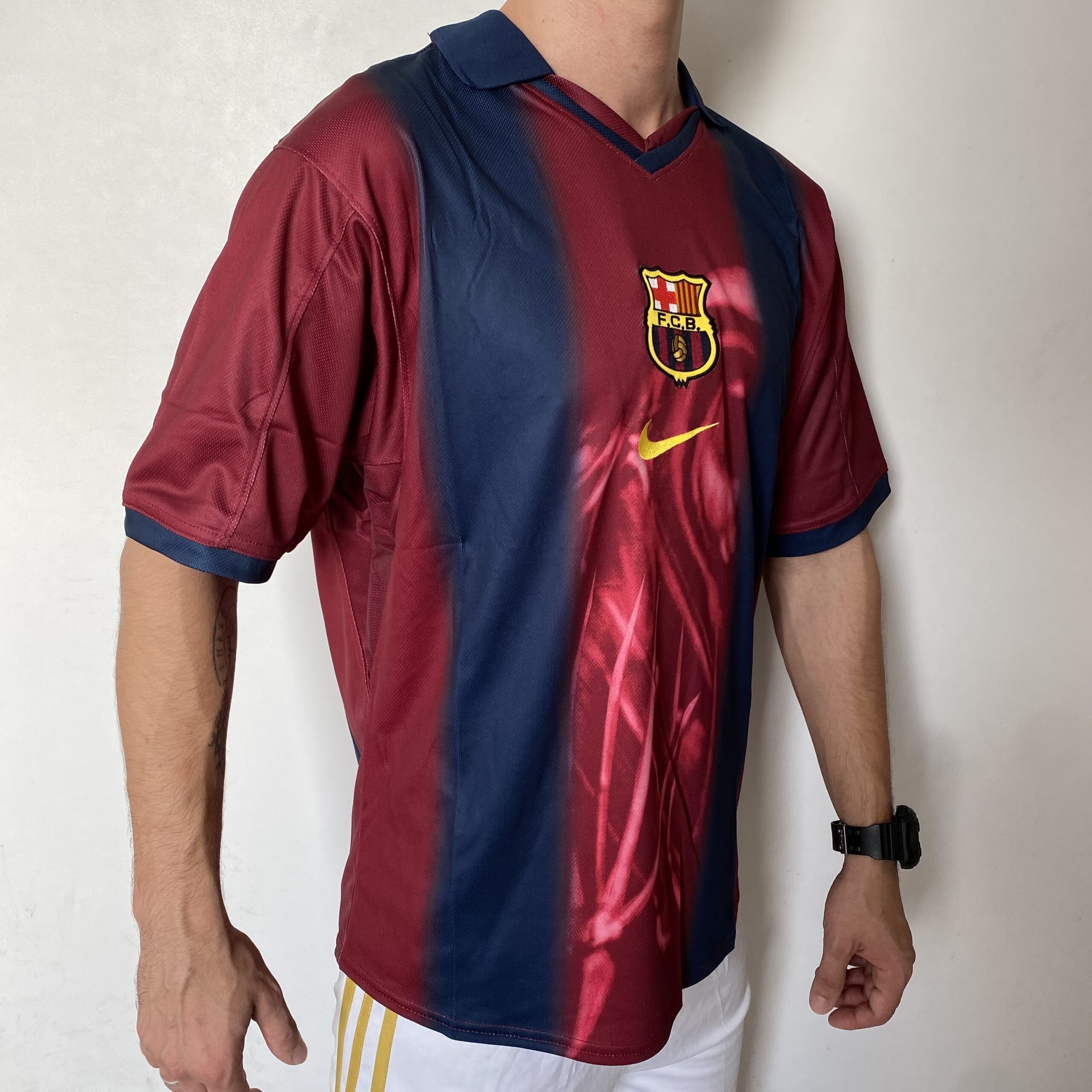 Elementos históricos do Barça estão preservados, com escudo clássico em destaque e acabamento pensado para fãs exigentes:-