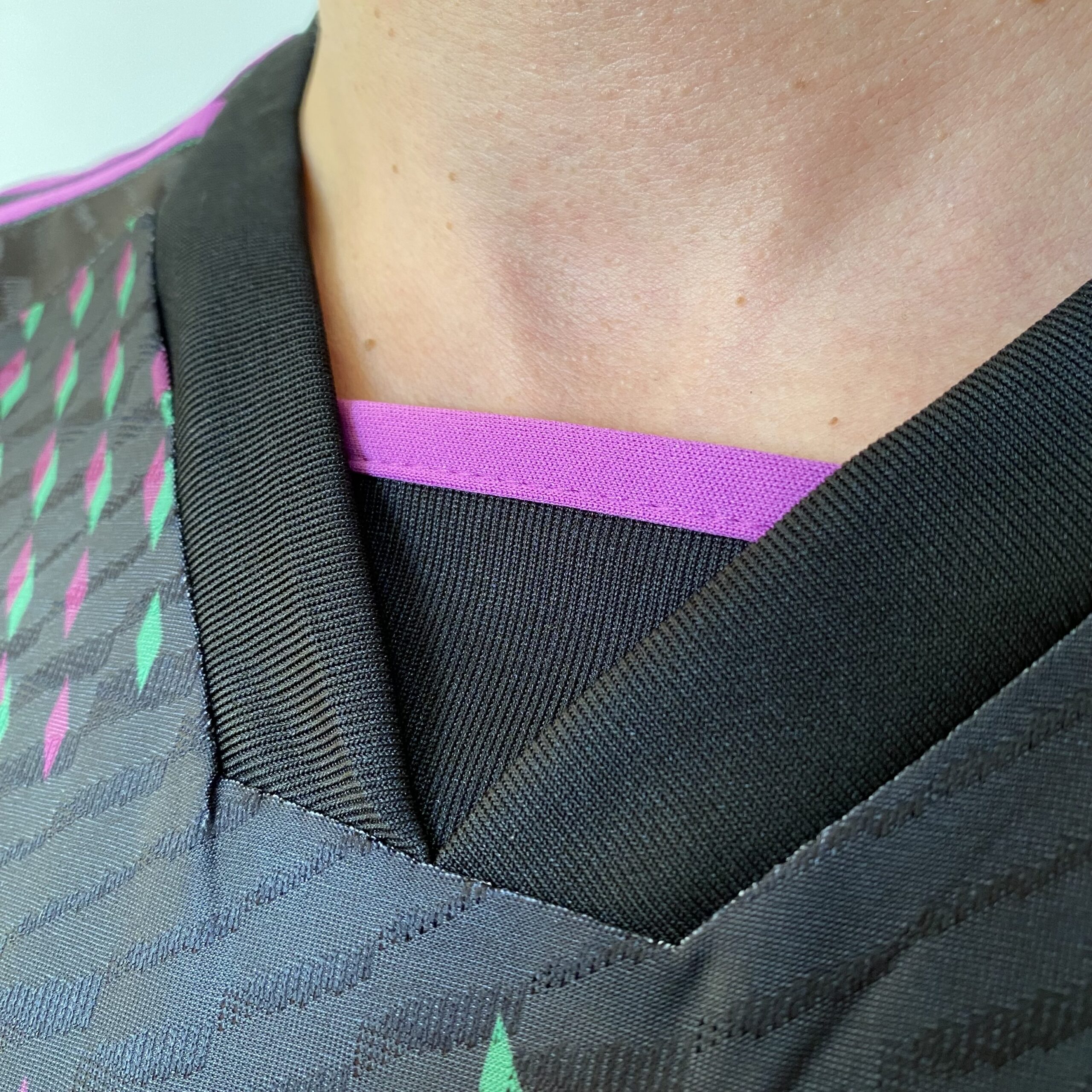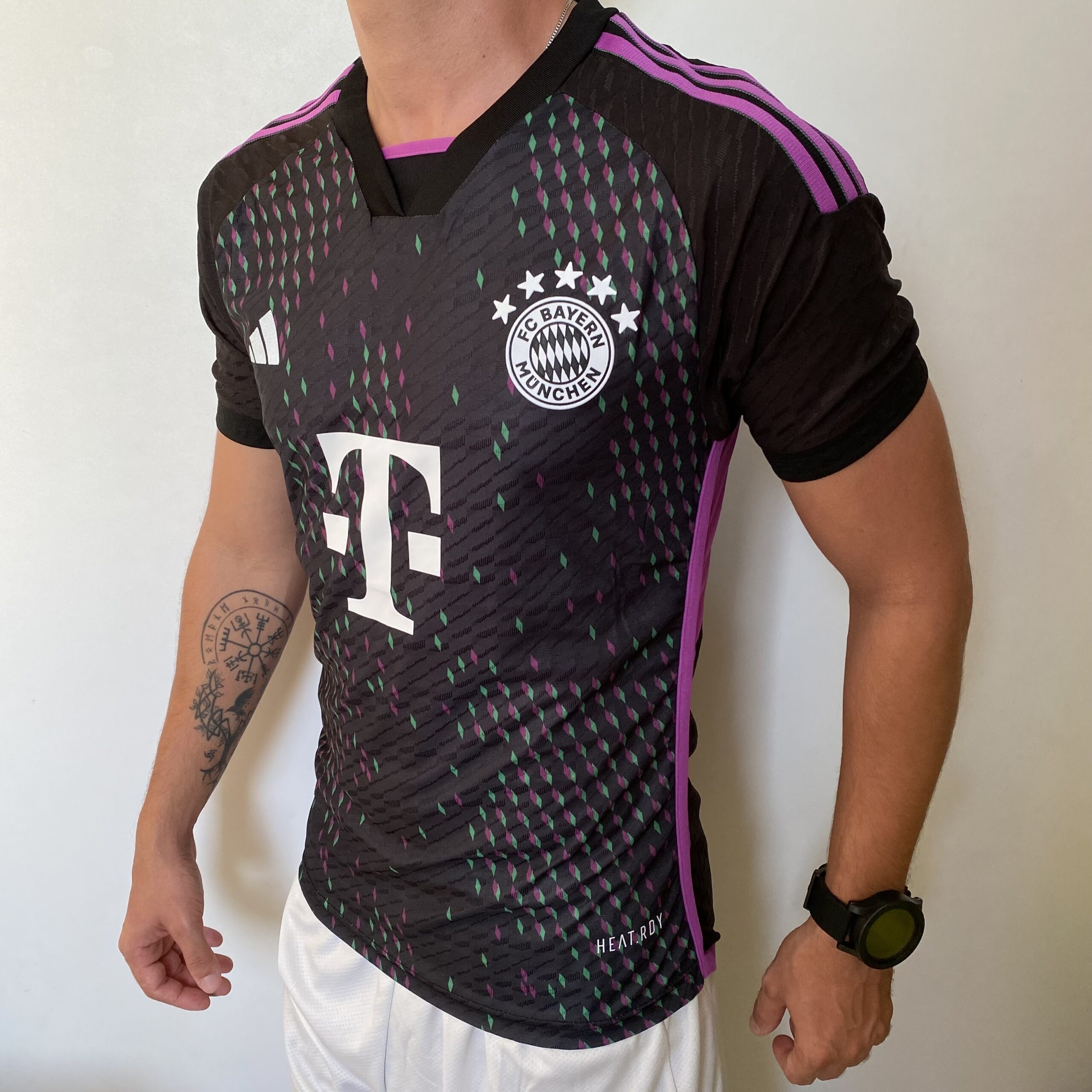 O novo manto away da equipe alemã homenageia sua fan base espalhada por todo o globo terrestre. A nova camisa reserva do Bayern de Munique é baseada no template padrão da marca para a temporada e é predominantemente preta, com diversos diamonds, nas cores verde e violeta, formando o mapa mundi na região frontal. As três listras nas mangas, as faixas laterais e as dorsais são violeta, assim como o nome do time nas costas.