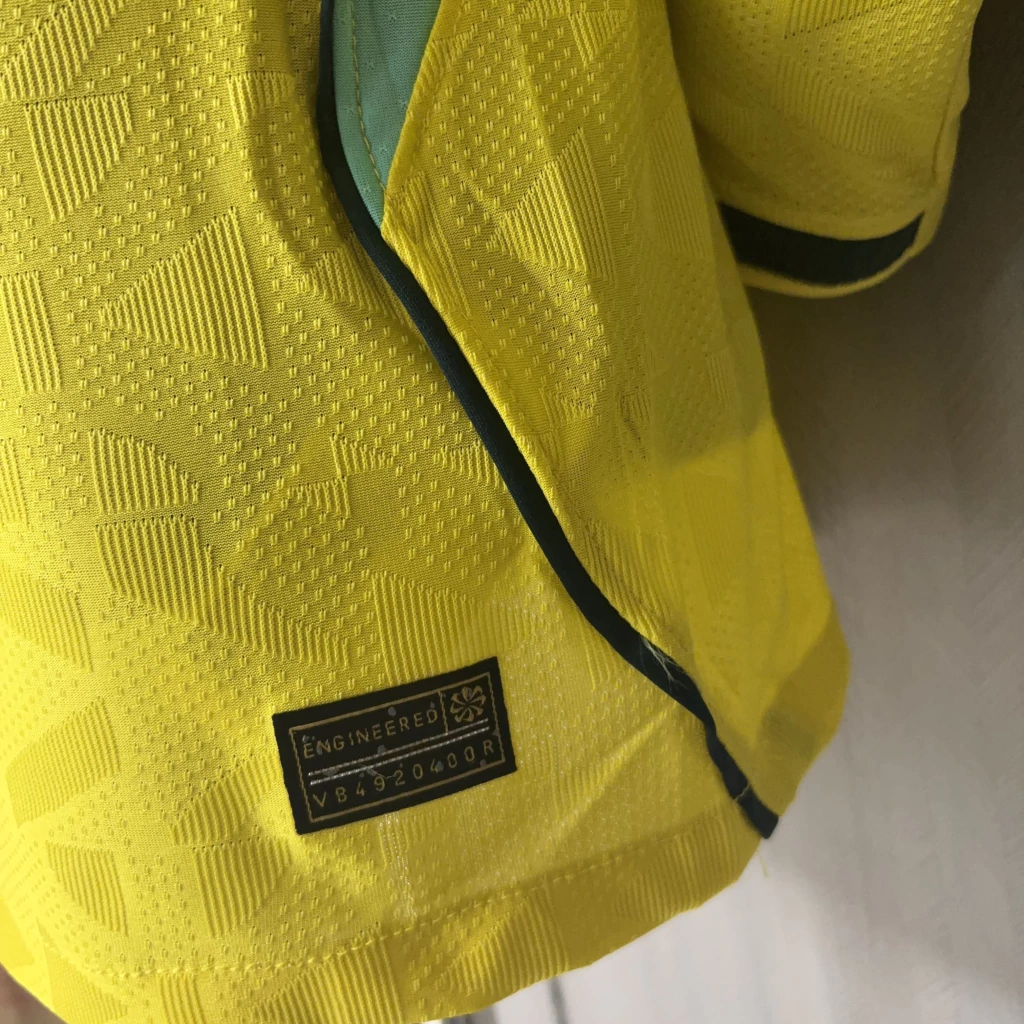 A camisa titular do Brasil trará o novo template da marca americana como base e não terá muitas “invenções”. Nas imagens podemos ver que o amarelo volta a ter um tom mais escuro, após dois modelos mais claros, e tem gola redonda com uma ponta triangular na frente, em verde, num tom mais escuro (Geody Teal), assim como era em 1970, padrão que também será visto nos punhos. Os demais detalhes do modelo, como arcos nas dorsais e finas linhas nos ombros e laterais do corpo, além dos punhos, são verdes (Light Menta). O escudo é aplicado no lado esquerdo no peito, com o Swoosh em verde no lado direito. Dentro da gola, um selo especial traz um losango com a palavra “Vai Brasa”.