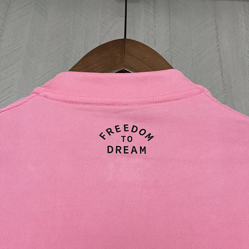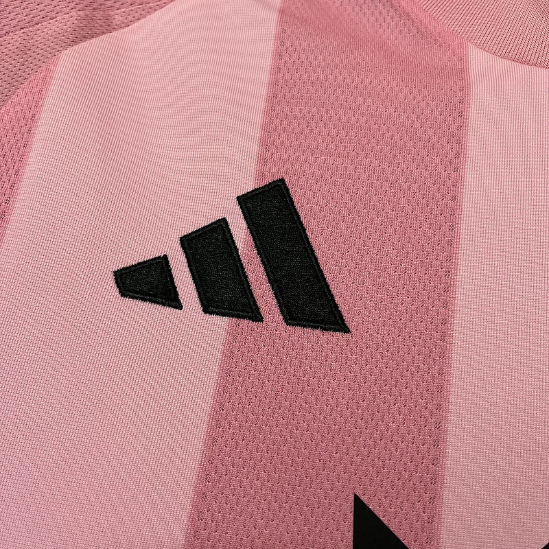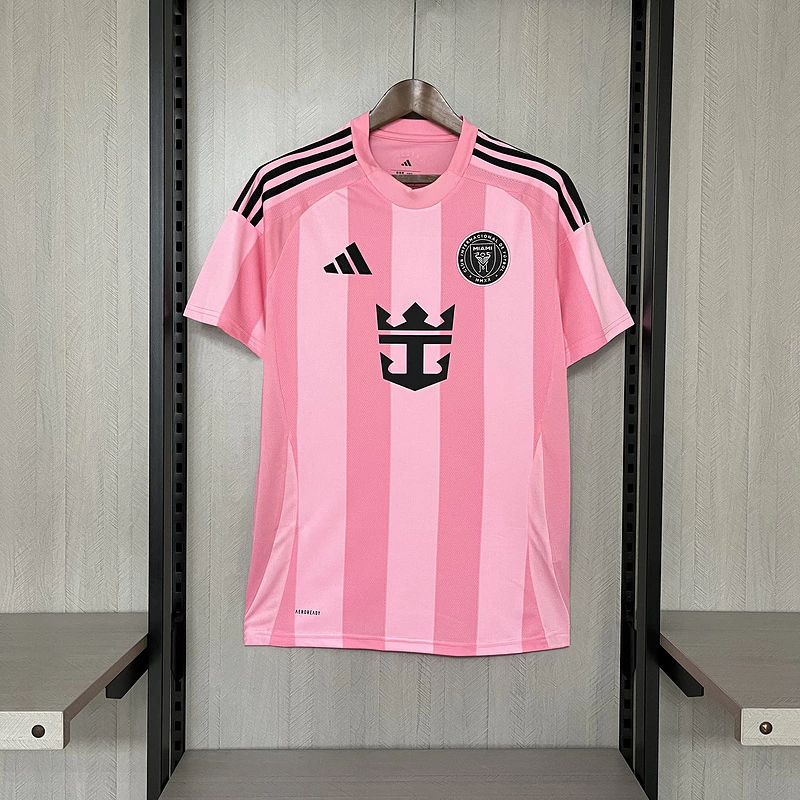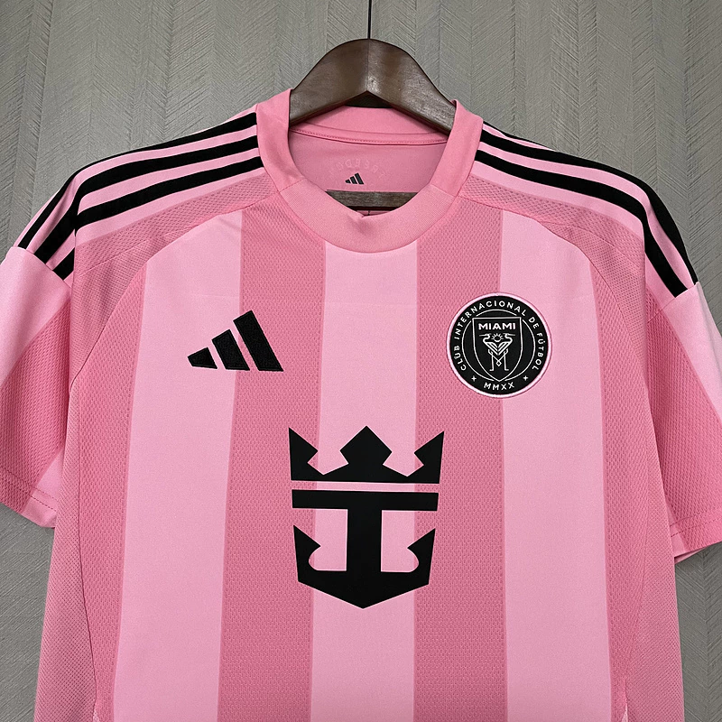 A nova camisa titular traz o template Tiro24 como base e tem listras verticais na região frontal, em tons distintos de rosa, o que, apesar de não ter sido dito oficialmente, seria uma homenagem à Seleção Argentina e também ao Barcelona, obviamente por causa de seu principal craque. Segundo o clube, o nome “Euforia” “incorpora a paixão e a energia de abraçar as oportunidades de frente, sabendo que o Inter Miami está pronto para entrar em campo com os melhores e continuar sonhando alto”, afinal, o time encara, além da MLS, o Super Mundial de Clubes, neste ano, a CONCACAF Champions League e também irá para um novo estádio em breve, o Miami Freedom Park, com capacidade de 25 mil pessoas. O preto é a segunda cor, aparecendo nas três listras da marca, nas mangas, em faixa na nuca, na frase “Liberdade para sonhar”, no mesmo local, e na jocktag. O escudo do Inter Miami é aplicado no lado esquerdo do peito, em sua versão atual padrão, enquanto o logo da Adidas vai no lado direito, em preto, mesma cor do patrocinador, a Royal Caribbean, abaixo.