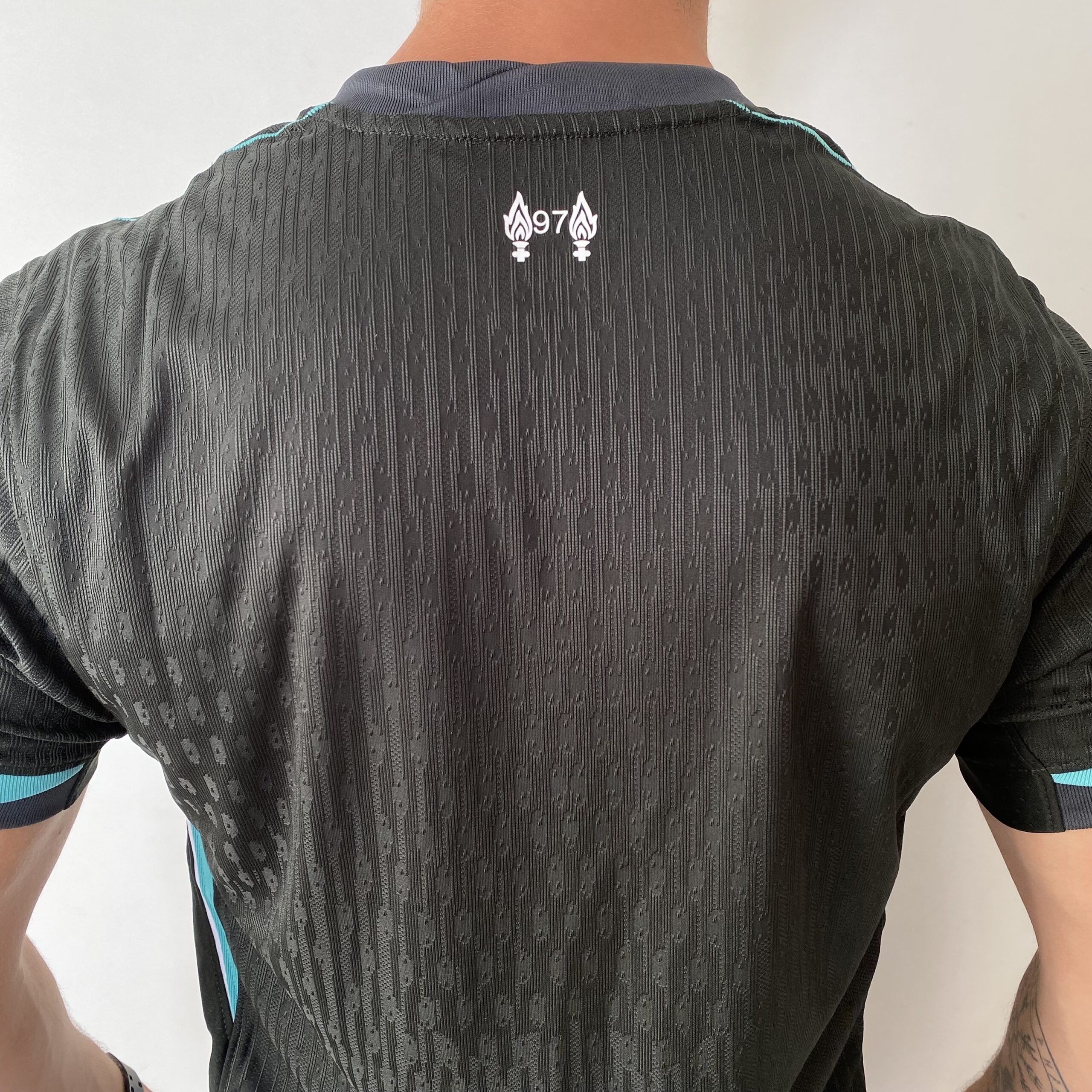 A nova camisa reserva do Liverpool para a temporada é baseada no template padrão da marca, com o verde escuro predominante e o verde “revisado” nos punhos e em finas linhas nos ombros. Nas laterais do corpo vão listras em cinza com detalhes brancos. No lado esquerdo do peito, o Liver Bird novamente representa o escudo e aparece em branco, enquanto no lado direito do peito, o swoosh é visto na mesma cor. Na nuca, novamente o número 97, uma lembrança às vítimas de Hillsbrough, aparece entre as chamas, em branco.