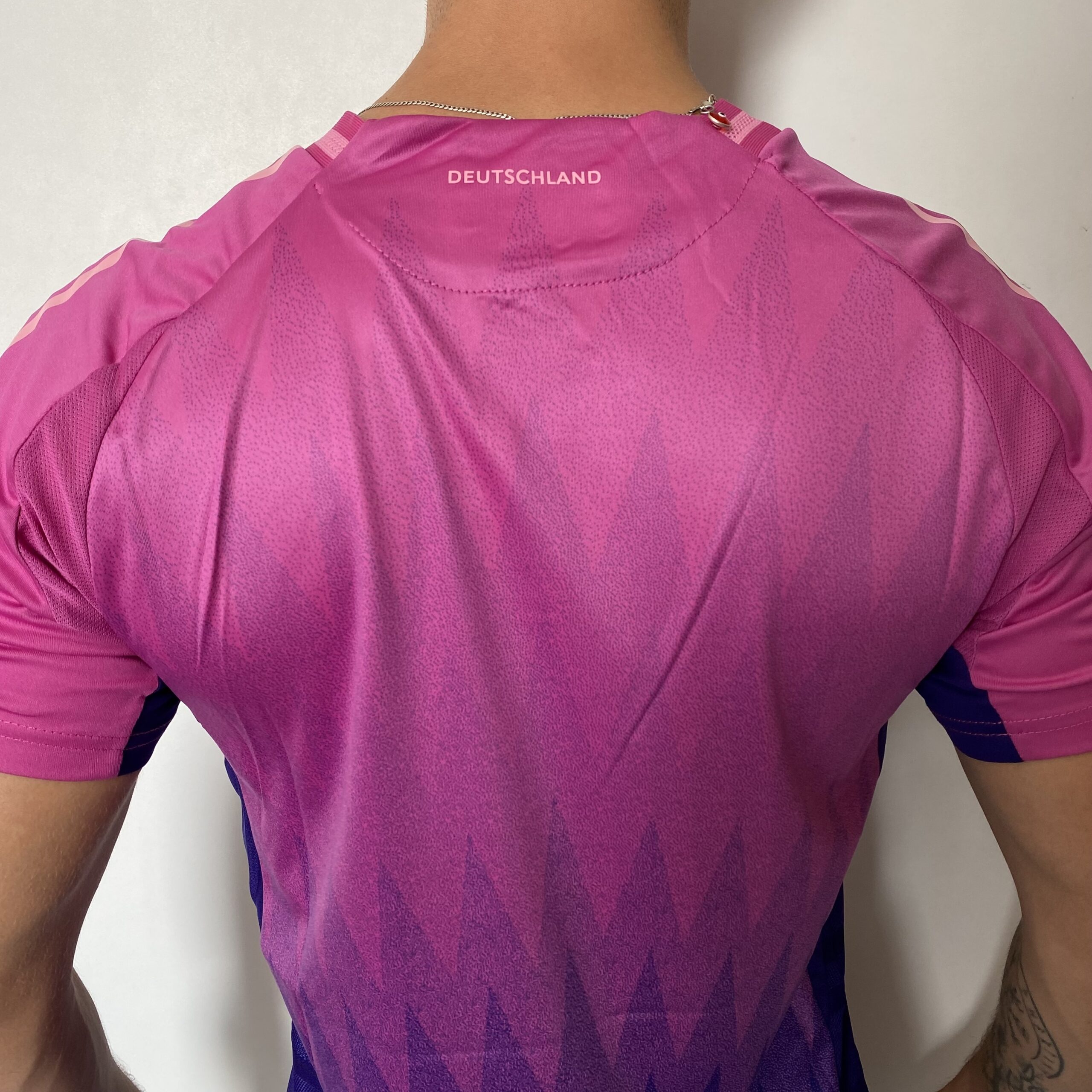Já a nova camisa reserva dos alemães para a Euro ganha uma combinação de cores inovadora e passa a ter a cor magenta com um degrade para o roxo, com efeito inspirado na águia, e que lembra a camisa utilizada na Copa do Mundo de 1994, na parte de baixo, lembrando muito mais uma camisa de goleiro do que de linha dos alemães. A gola também é redonda na cor magenta com friso central na cor rosa, que também é vista nas três listras que percorrem os ombros, e nos recortes curvos, nas laterais. O escudo da DFB é aplicado em magenta com elementos brancos, no lado esquerdo do peito, enquanto o logo da Adidas vai no lado direito, na mesma cor.
