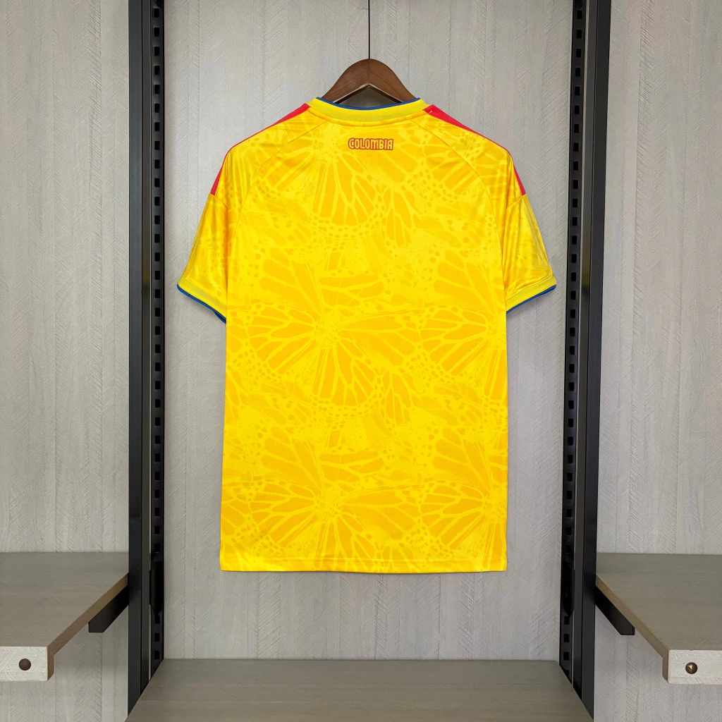 A nova camisa titular da Colômbia que será usada na Copa do Mundo 2026 traz o tradicional amarelo como base, com um grafismo no corpo inspirado nas borboletas amarelas de Gabriel García Marquez. As borboletas amarelas são um símbolo marcante nas obras do famoso escritor colombiano, representando o amor, a presença e a fatalidade, em diversas obras, como em “Cem Anos de Solidão”. A gola tem formato V com sobreposição, e é amarela, com faixa azul. As três listras nos ombros estão mais largas, tendência da marca para as novidades, e são vermelhas. A adidas estampa seu logo em azul, no lado direito do peito, enquanto o escudo da Federação Colombiana de Futebol vai no lado esquerdo, em sua versão atual padrão.