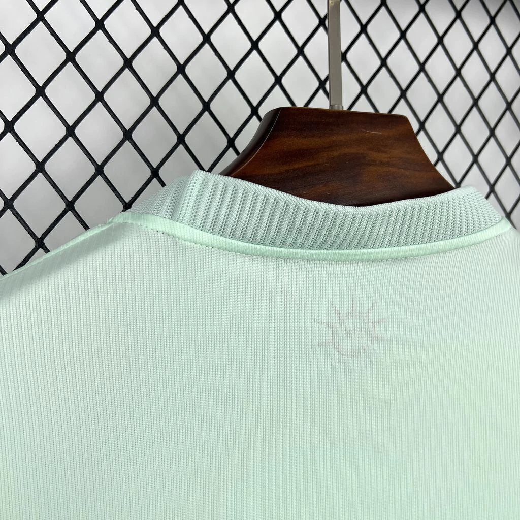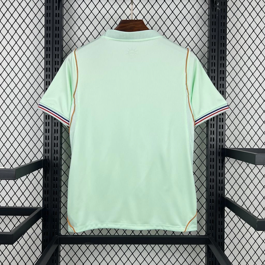 A nova camisa reserva da França ganha a cor verde menta, baseado na estátua que é feita de cobre e com a oxidação dos anos, ganhou o tom esverdeado. A gola é redonda com um detalhe frontal triangular, que será muito usada pela Nike na nova temporada. Os punhos ganham detalhes tricolores, inspirados na bandeira nacional. Por sua vez, o escudo com o icônico galo e o logo da Nike aparecem em um tom acobreado com estilo brilhoso. Dentro da gola, um símbolo traz inspiração na coroa da estátua e traz dentro a palavra “Libertè”.