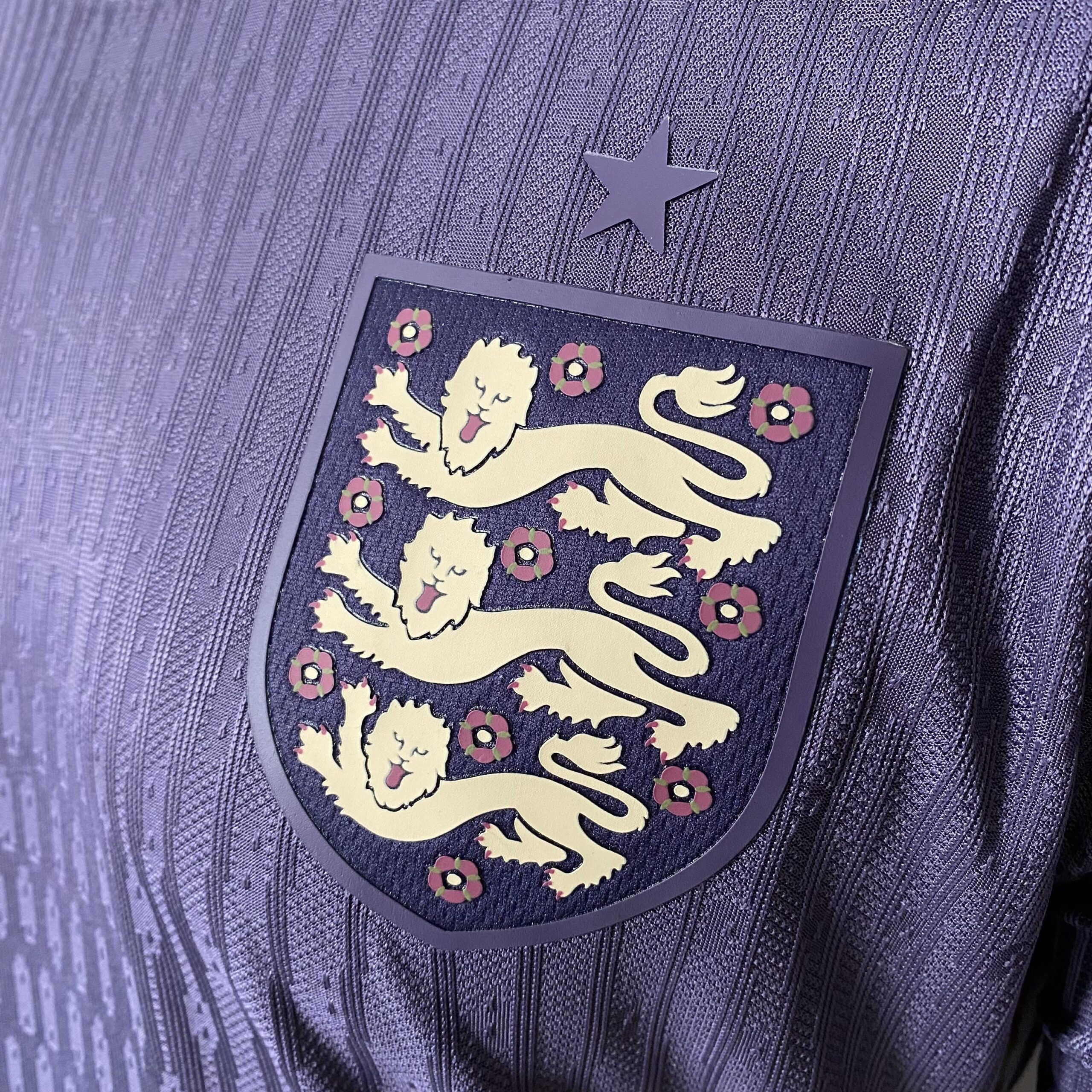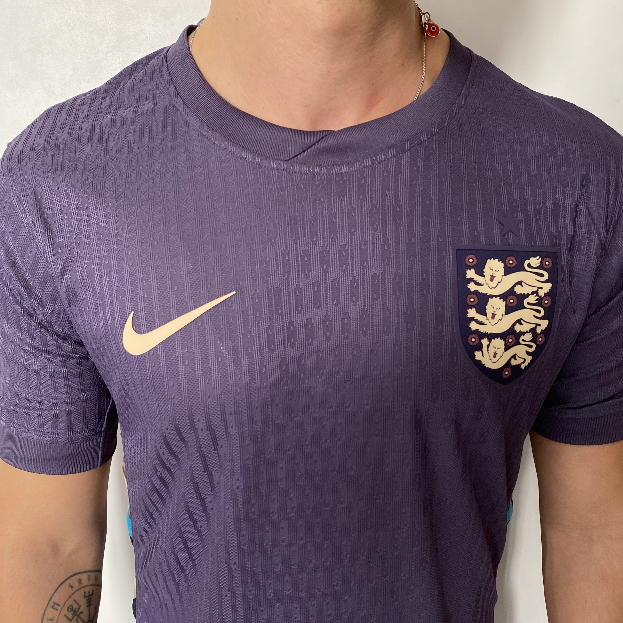 O novo uniforme away dos ingleses foge do convencional e mistura as duas cores complementares, o azul e o vermelho, formando um tom de roxo chamativo e atraente, que reflete a energia jovem da seleção, dentro e fora de campo. O escudo e o logo da Nike no peito, ganham elementos em dourado, que se destacam sobre a base arroxeada. Já os painéis laterais ganham gráficos que apresentam sete cores diferentes e homenageiam o estilo inovador do país, ao mesmo tempo que enfatizam a bandeira de São Jorge na gola.