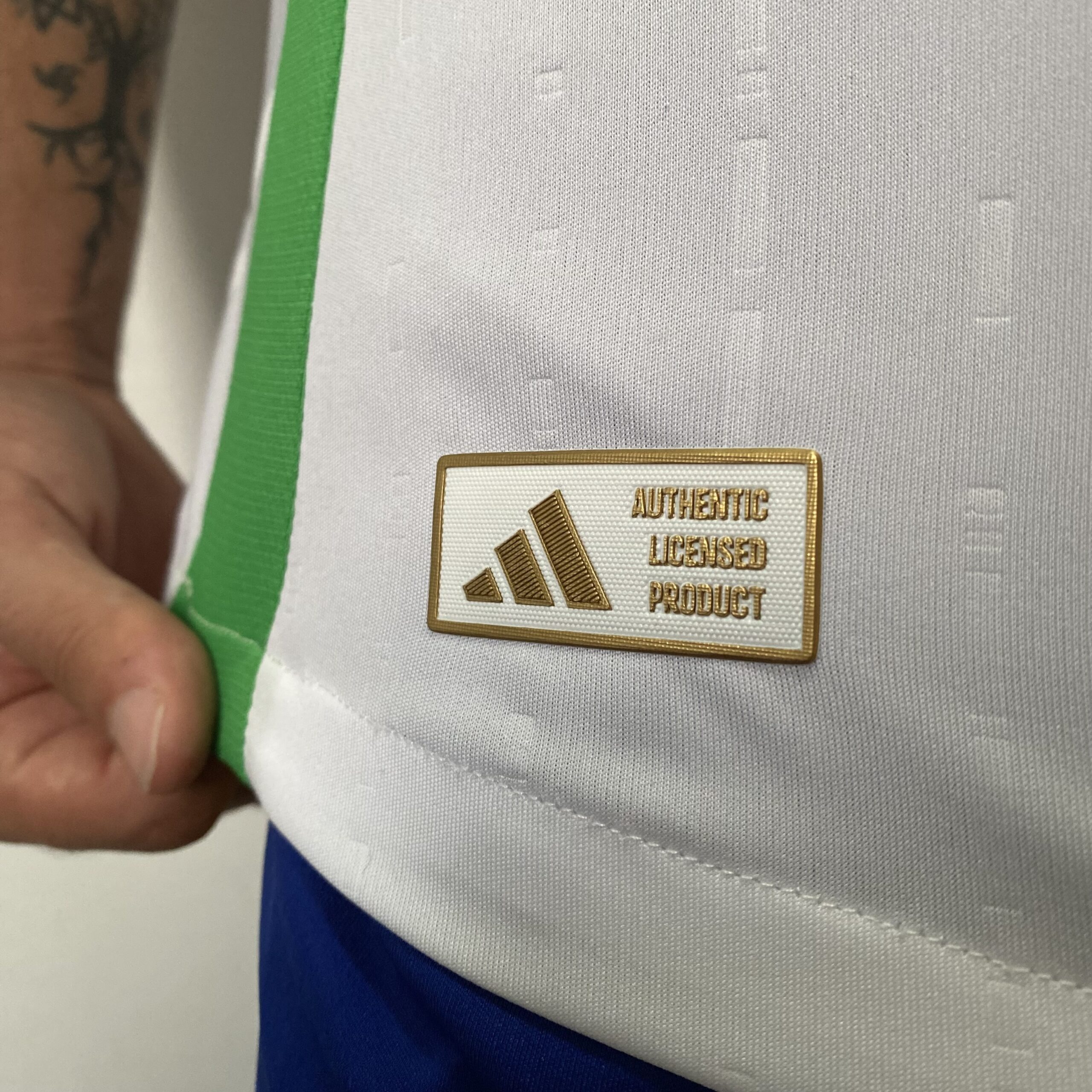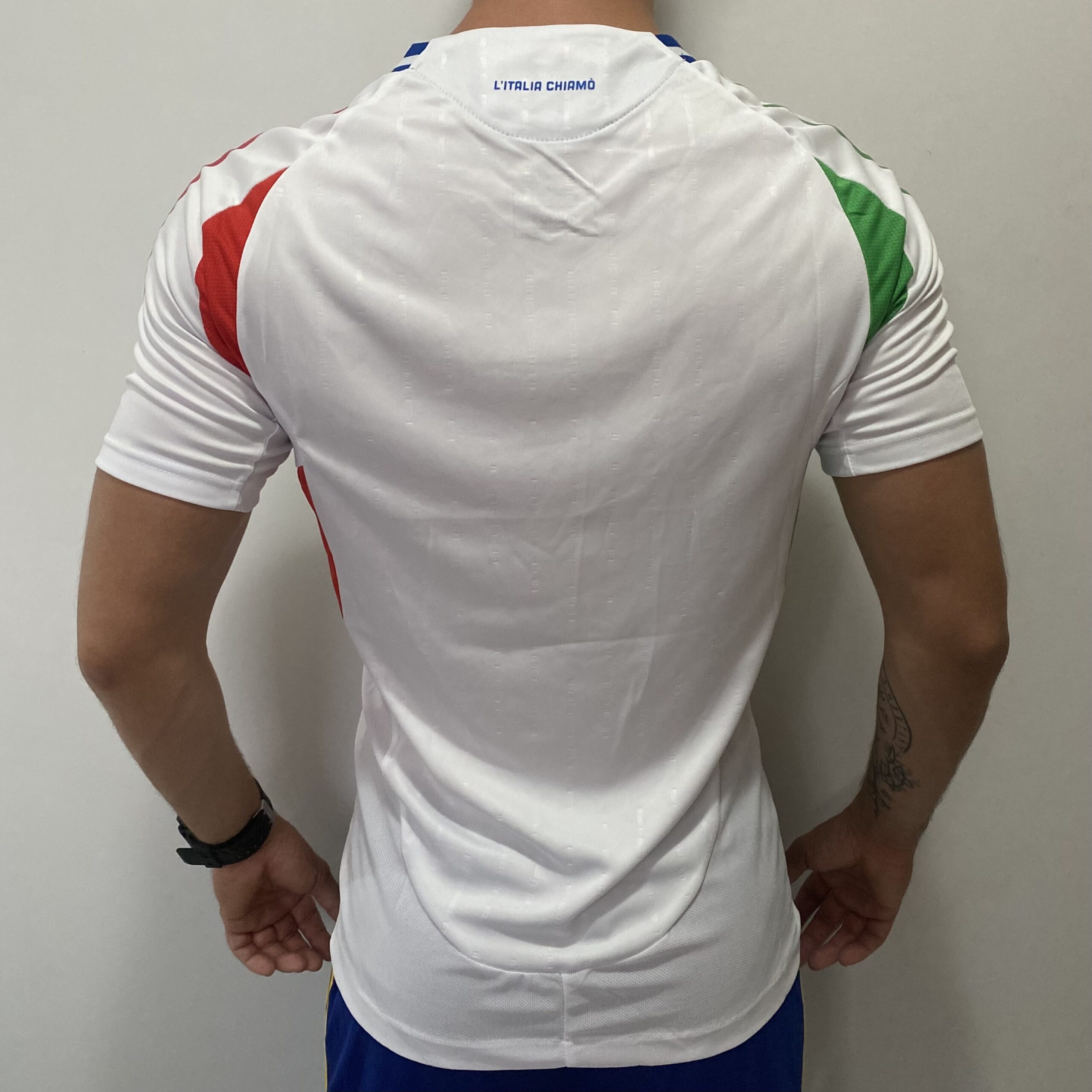 O manto reserva é o que chama mais atenção. Isso, porque ele dá muito mais destaque às cores da bandeira. O template é o mesmo do manto titular, com o branco de fundo. No lado direito do corpo, as três listas na manga são verdes, mesma cor do arco lateral e detalhes do template nas axilas e dorsais. No lado esquerdo, isso tudo é vermelho. A gola traz um formato V, com o vértice na cor predominante e as laterais em azul, com uma fina faixa branca. Na nuca, é possível ver a frase “L’Itália Chamò”.