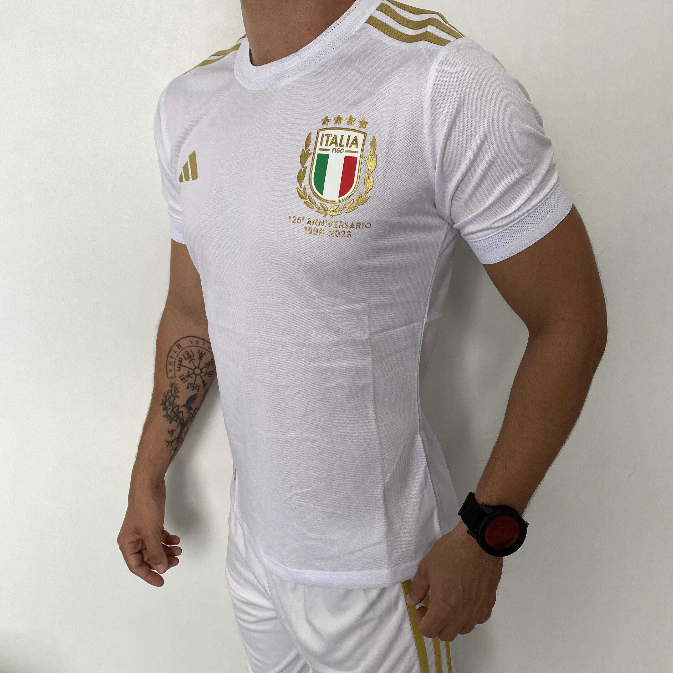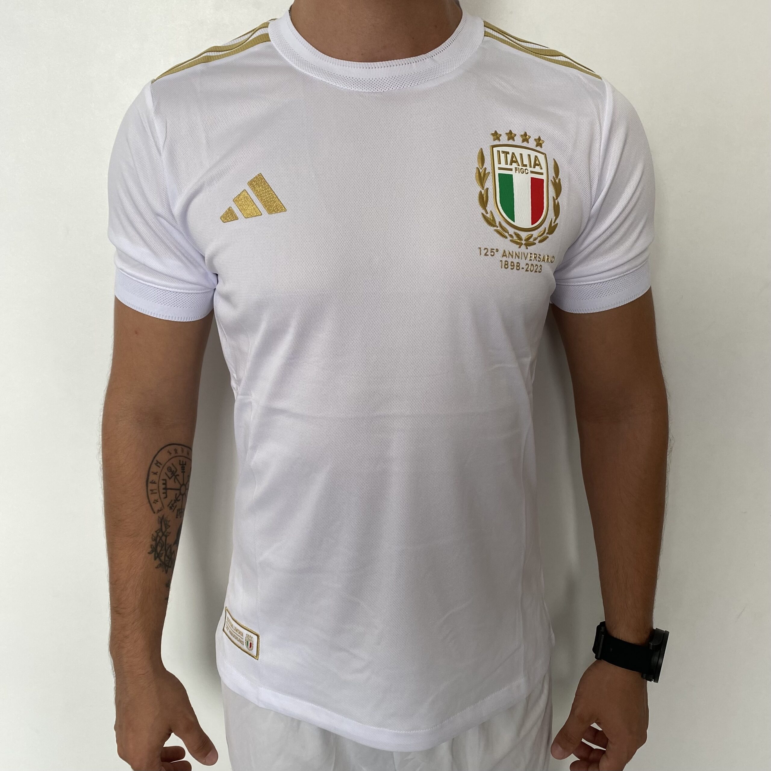 A nova camisa especial de aniversário para a Seleção da Itália, que comemora 125 anos de existência em 2023. O novo manto tem um visual bem clássico, na cor branca, em referência ao primeiro uniforme da história da Seleção da Itália, com as três listras da marca em dourado nas mangas.