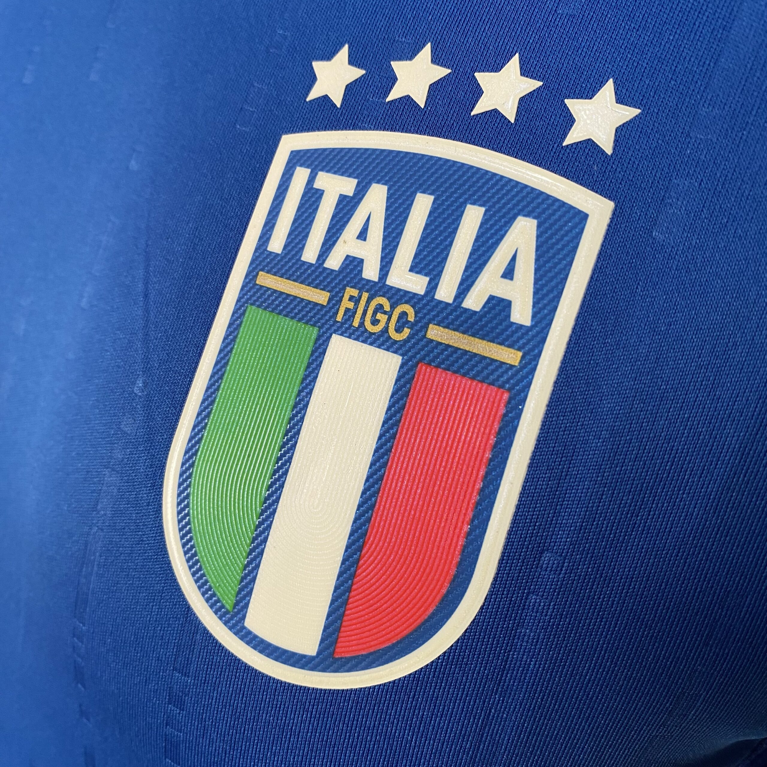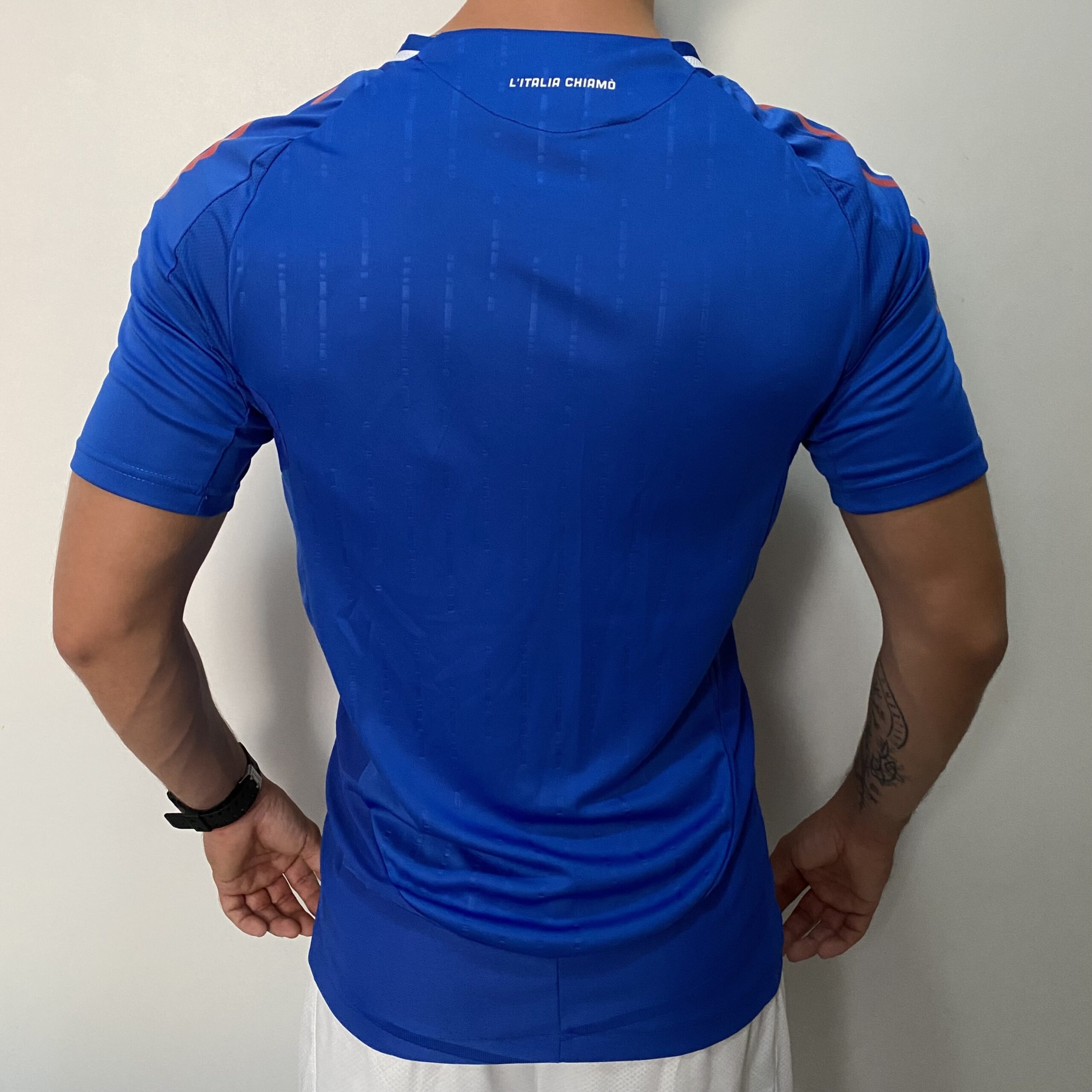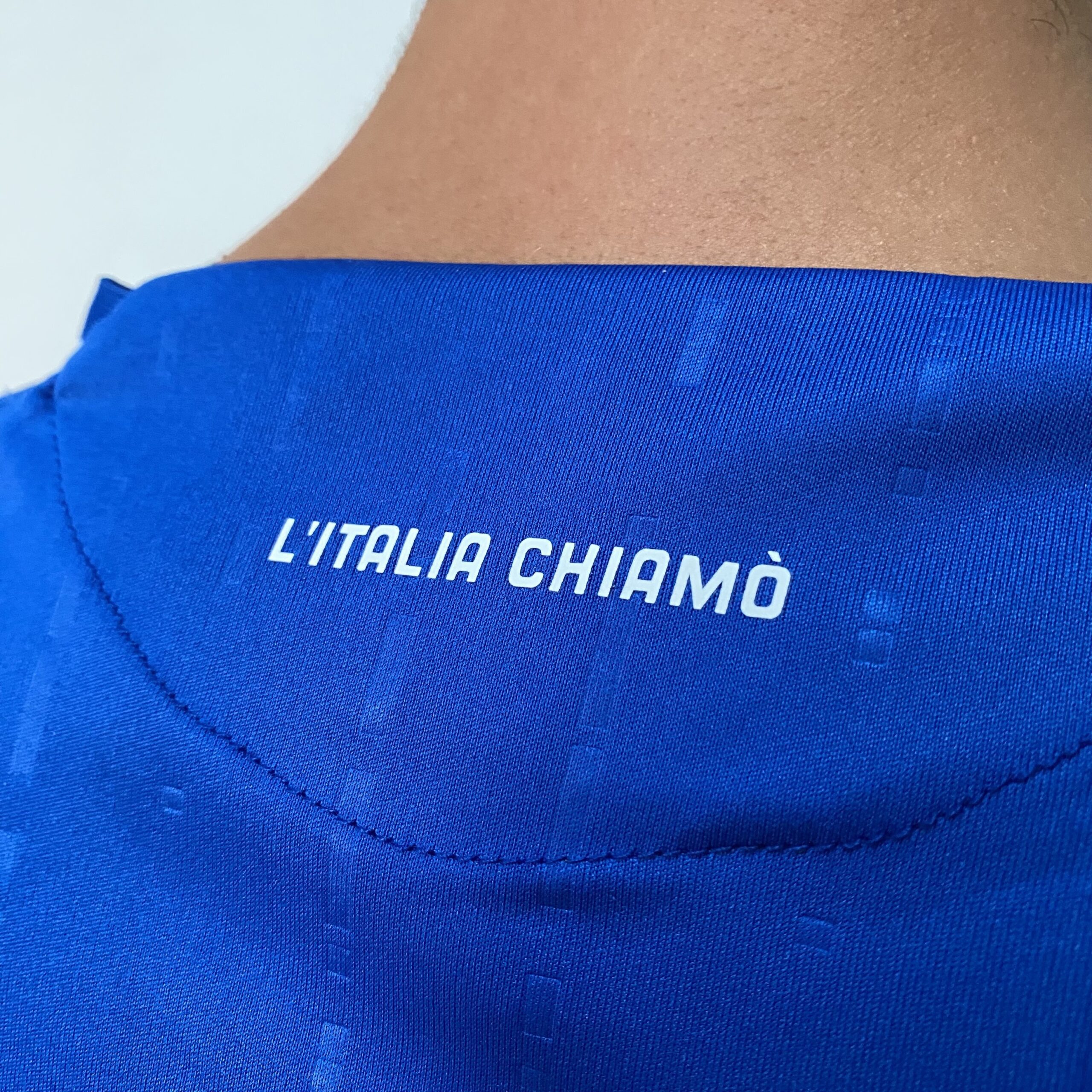 A camisa titular da Itália traz o azul royal como cor predominante, com os dois arcos do modelo nas laterais em branco. No corpo, são colocadas finas linhas verticais em embossing. Enquanto isso, nas laterais do corpo, é utilizada uma tonalidade mais escura do azul royal. As três listras nas mangas trazem as cores da bandeira nacional, enquanto a faixa centralizada na gola é branca. Na nuca é escrita a frase “L’Itália Chiamò”, retirada do hino nacional.