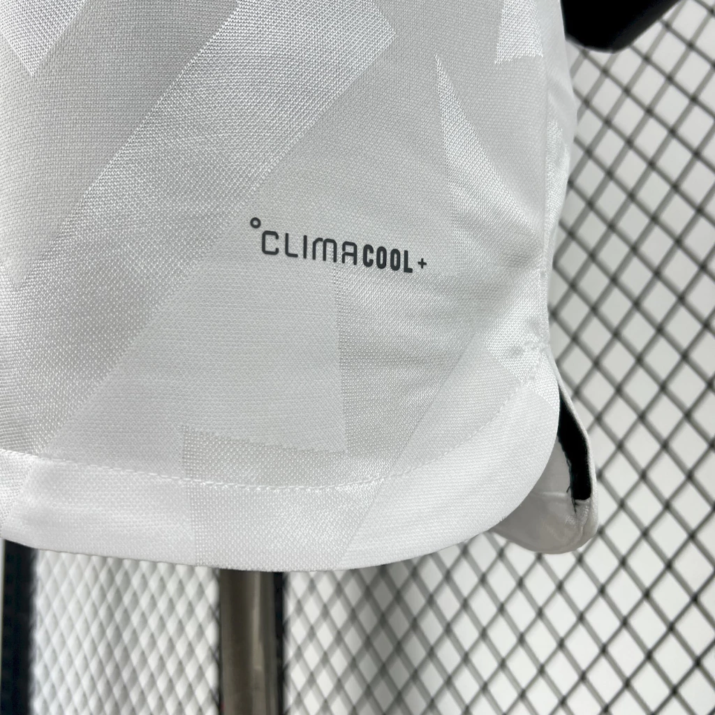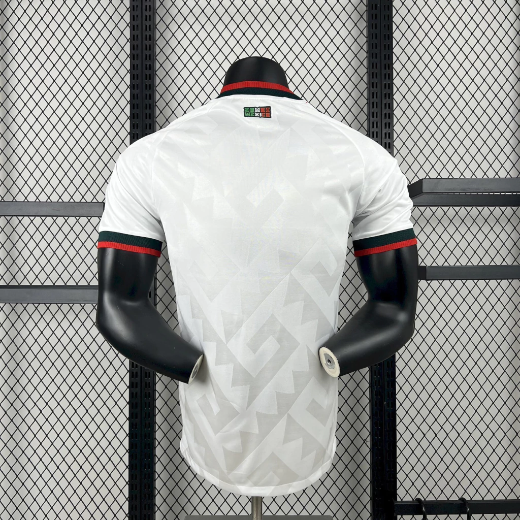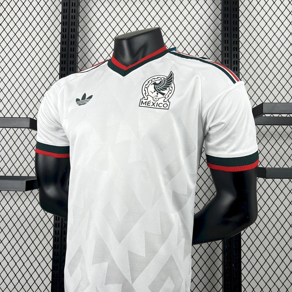 O manto reserva do México bebe da rica herança cultural do país ao incorporar uma padronagem cinza sobre fundo branco, inspirada nas tradicionais “grecas” vistas na arquitetura e nas artes mexicanas. O desenho traz formas geométricas que lembram degraus, evocando as estruturas escalonadas típicas de construções históricas. Na parte de trás da gola, a frase “SOMOS MÉXICO” reforça o sentimento de união e paixão nacional, especialmente em um momento simbólico, com o país prestes a sediar mais uma Copa do Mundo.