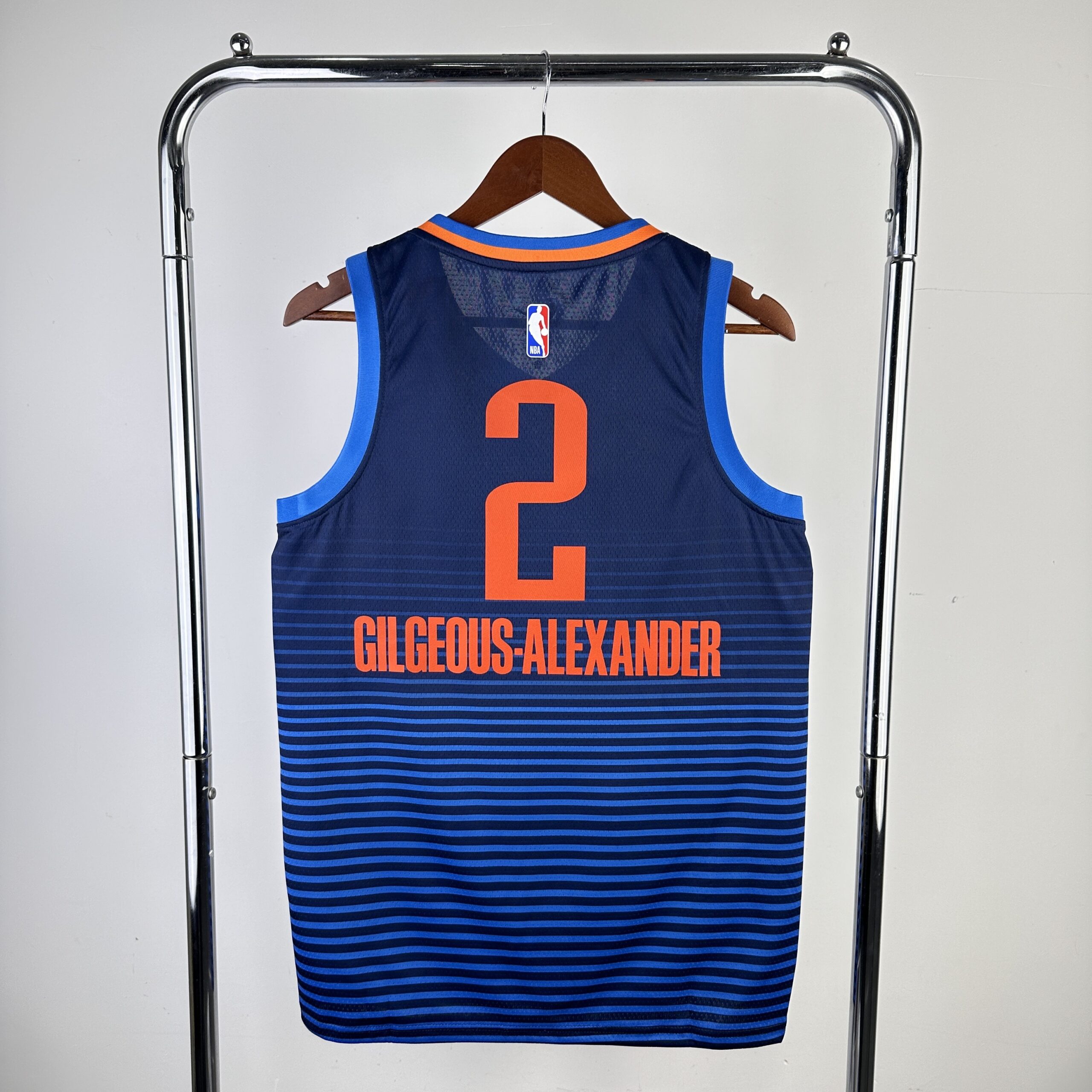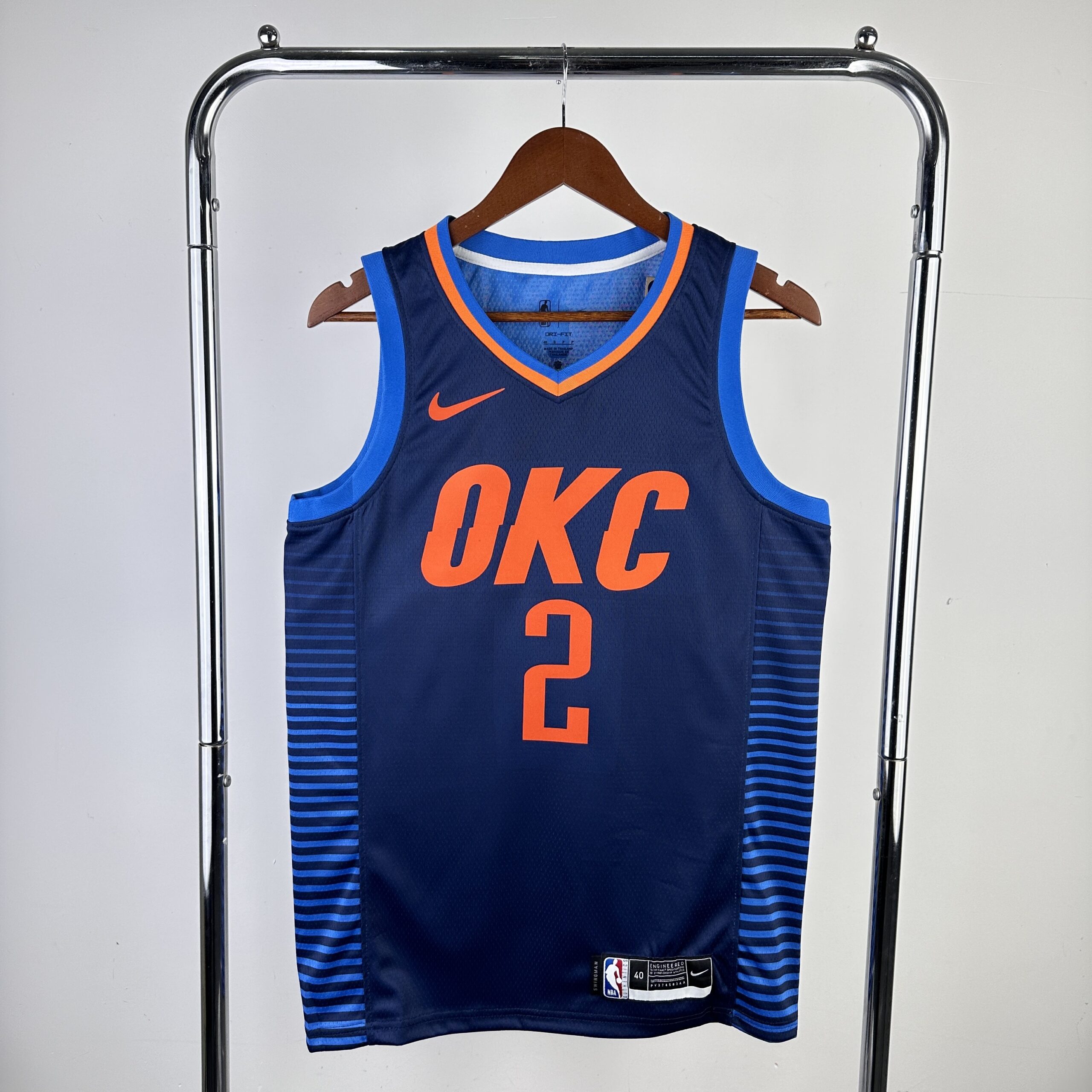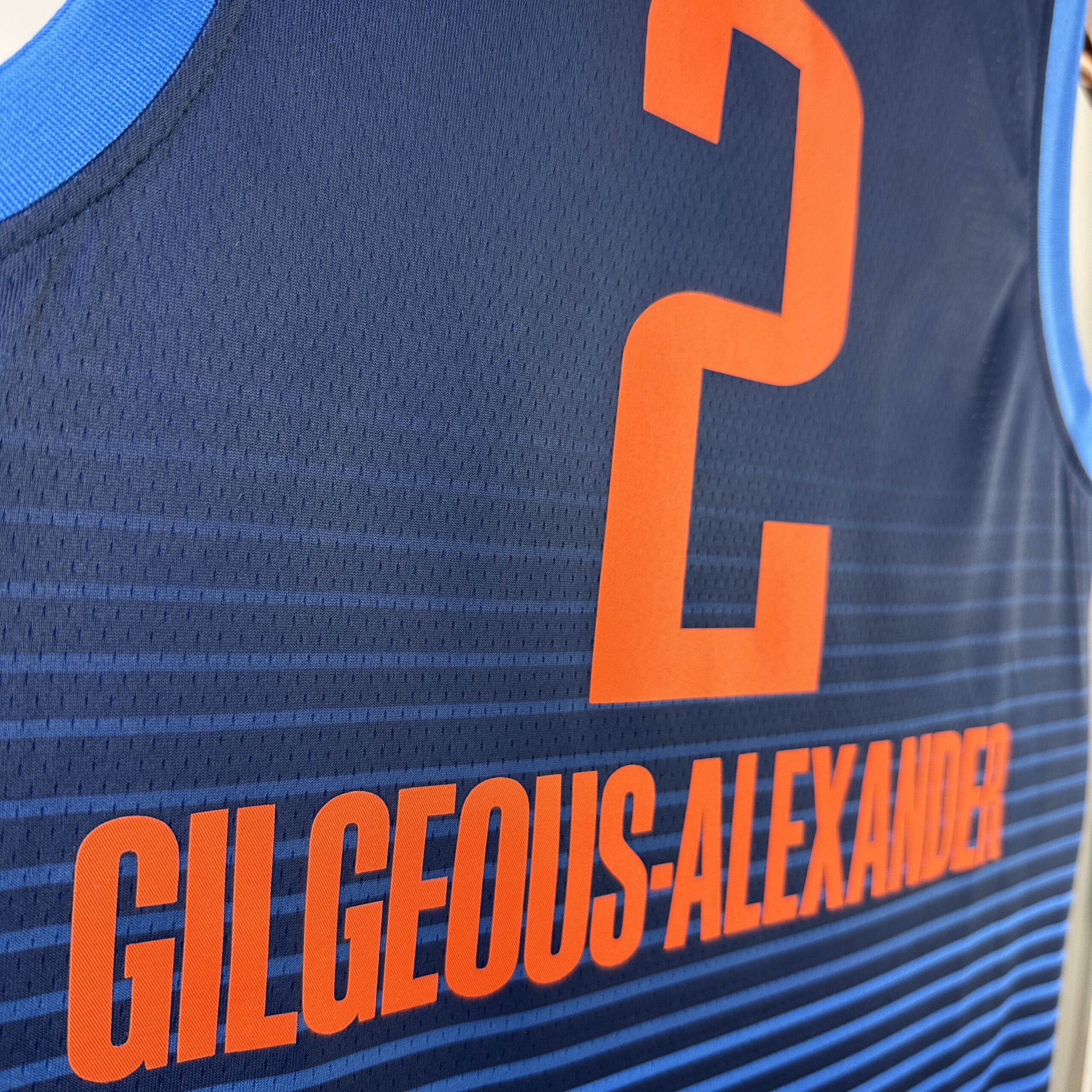 O Thunder restringiu o design sublimado que cobria o uniforme City Edition do ano passado aos painéis laterais, usando o mesmo esquema de cores azul-marinho, laranja e dourado. Eles também trocaram a marca inclinada “OKC” por uma versão somente estadual da marca “Oklahoma City”.